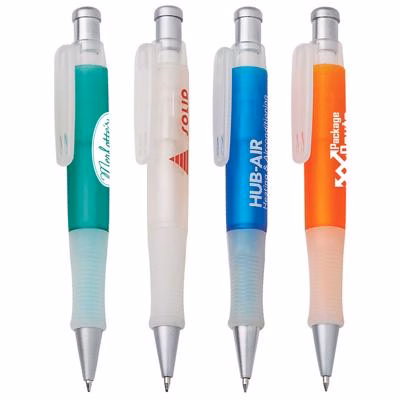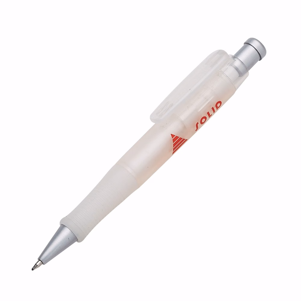 Push-action pen featuring a frosted-coloured barrel with a clear rubber grip for enhanced comfort and control. Accented with sleek silver trim for a stylish touch. Equipped with a high-quality black German ink refill, providing a smooth writing experience with an extended 2,000m writing distance.