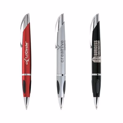The Protrusion Grip Pen is designed for comfort with soft, raised grip pads that make writing smooth and easy. Its twist-action mechanism and polished chrome-plated steel clip give it a crisp, modern look. Presented in a black velour sleeve (Product Code GZ163), it's ready to impress. Supplied with black ink.