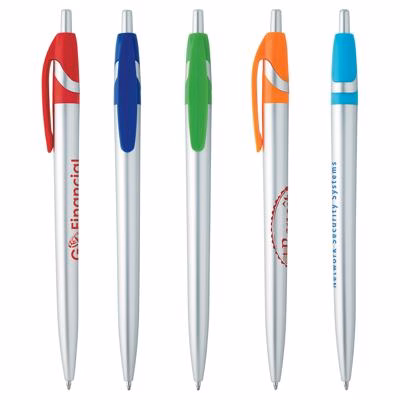 A sleek silver plunge-action pen with vibrant colour accents that make your branding pop. Clean, classic, and easy to write with, it's a smart way to brighten up any stationery collection. Supplied with black ink.