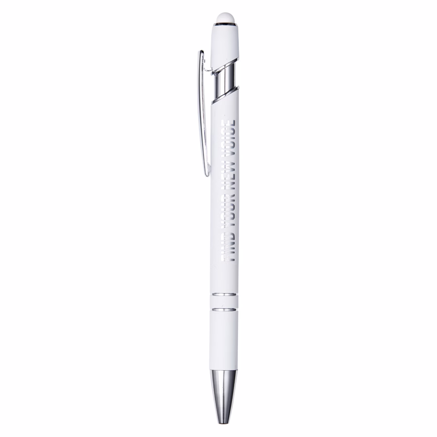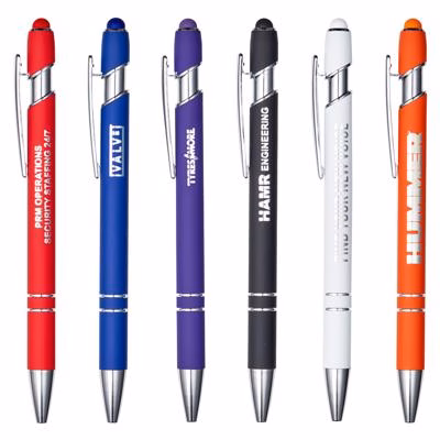 Click action metal pen with unique rubberised finish comes with black ink. Pen features matching stylus tip. Each pen engraves to expose a stunning matte finish.Product Dimensions: 142mm longWriting distance: 500M