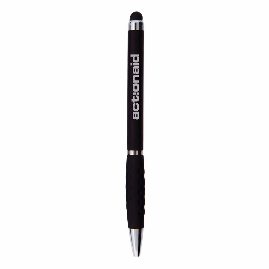 A dual-purpose plastic twist action pen featuring a soft stylus orb. The pen has dimpled ergonomic rubber grip. Stylus ball on the end of clip works great with your mobile device, iPad, tablet, or other tech devices. Enjoy the functionality and convenience this pen will bring. Comes with black ink.