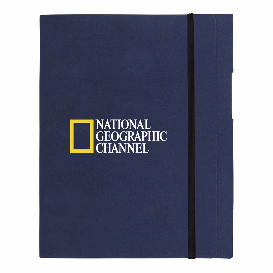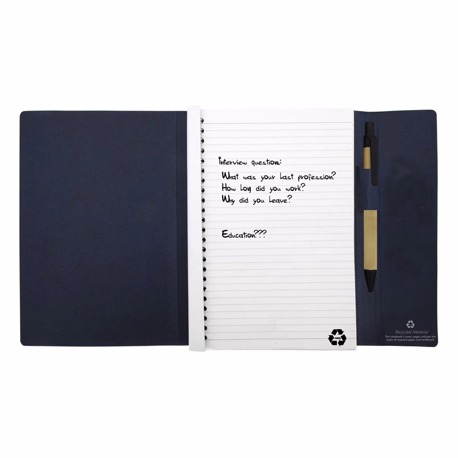 The Large Tuck Journal takes sustainability to the next level. With a heavy, flexible paper cover made from recycled material, it features 85 pages of recycled lined paper, plus a blank black ink pen crafted from recycled paper. The elastic band keeps everything secure, and both the inside cover and each page proudly display the recycled logo. It's a larger, eco-conscious option for those who want to make a difference with every note!