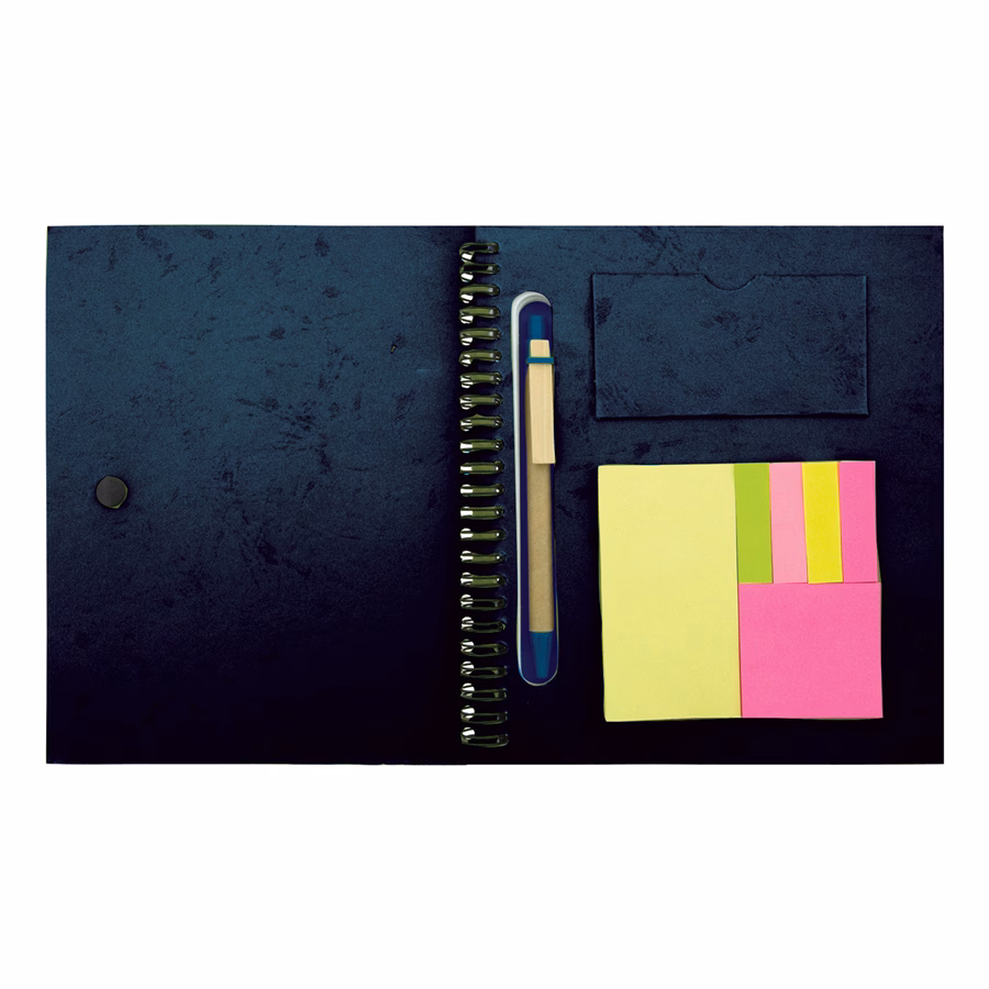 This eco-friendly journal is the ultimate tool for staying organised while making a sustainable choice. With a durable cardboard cover made from recycled paper and a sleek black snap closure, it offers 70 pages of recycled lined paper, printed with soy ink. Featuring the recycled logo on each page and the back cover, it's a great way to showcase your commitment to the environment. Plus, it includes a recycled blank black pen, large and medium yellow adhesive notes (25 sheets each), and five colours of adhesive note flags to help you highlight what matters most!