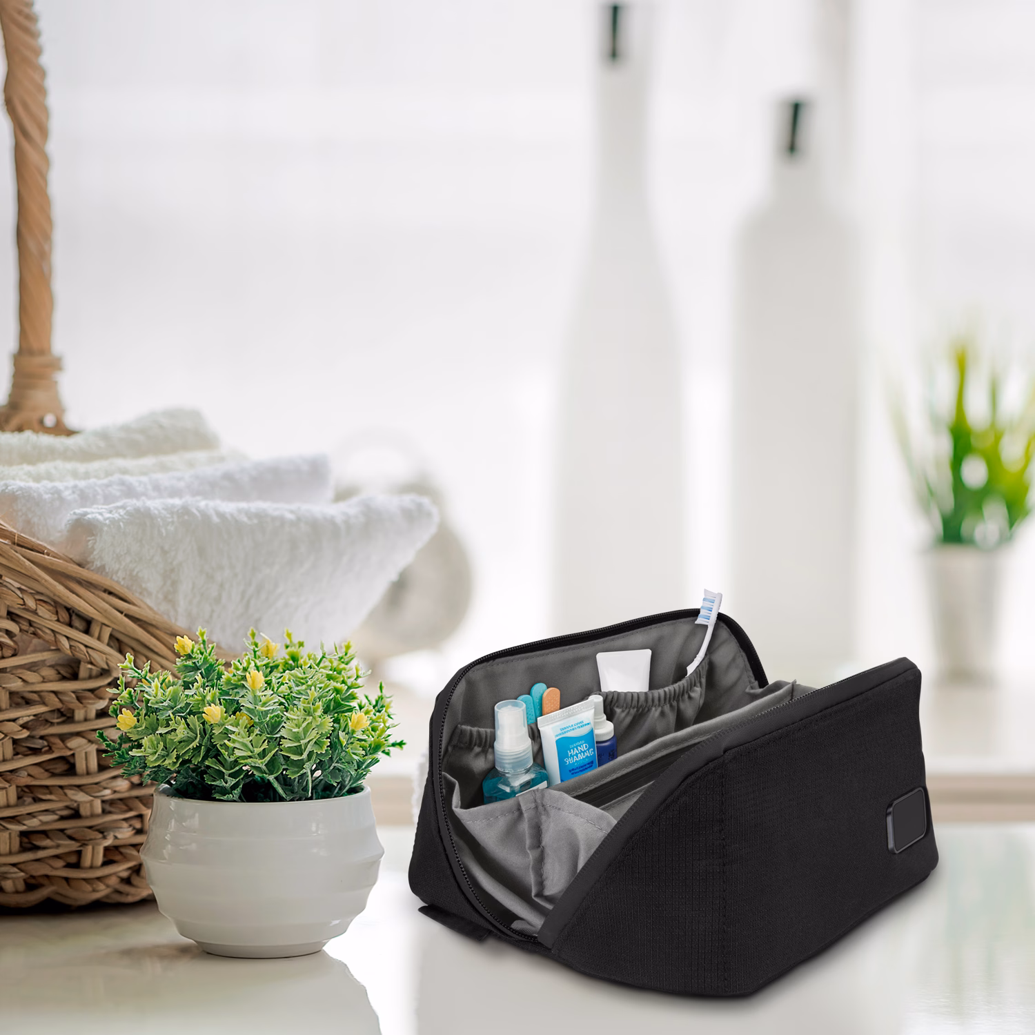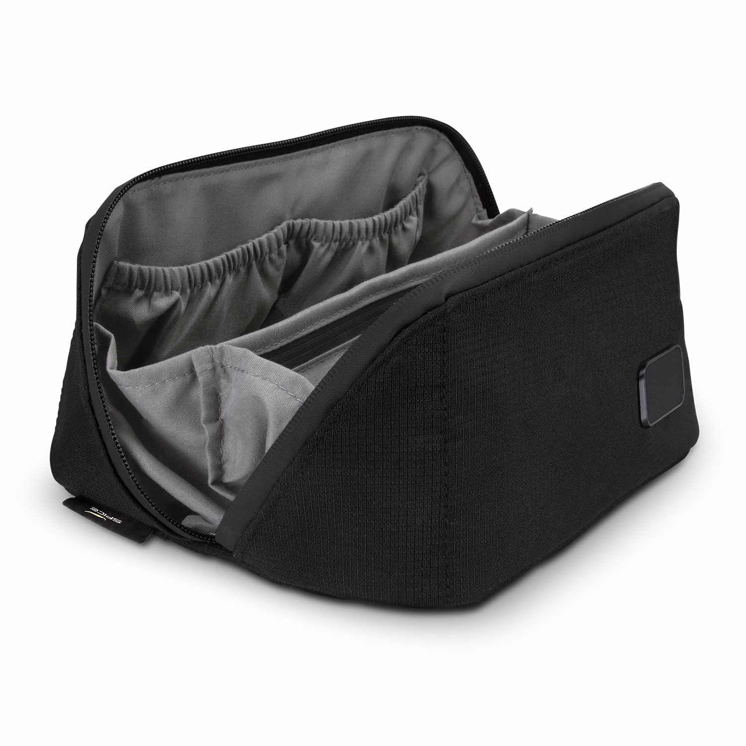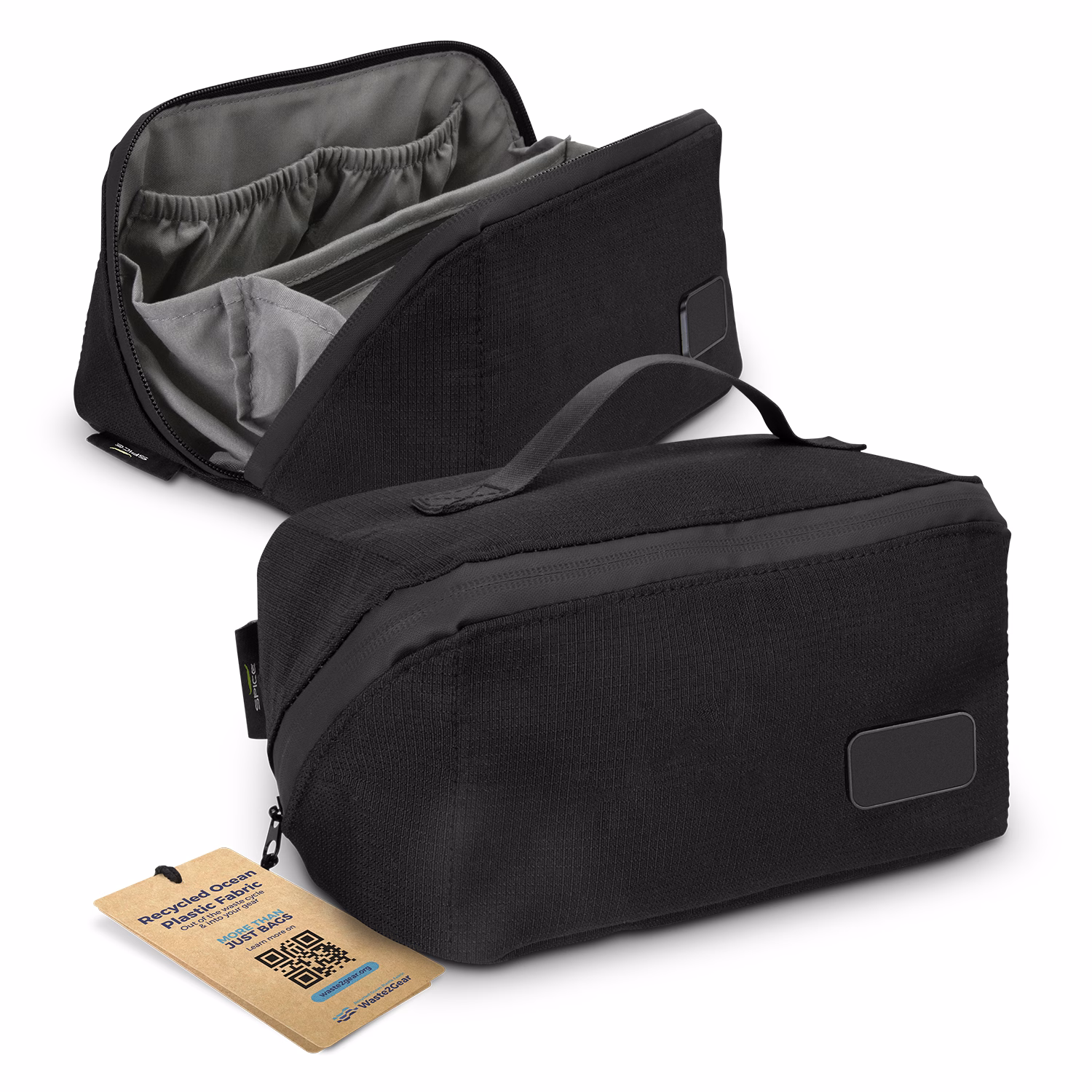 SPICE strive to create extraordinary products that have a positive impact on the planet. Their Waste2Gear range uses recovered ocean plastics, which are gathered, cleaned, and converted into fibres and woven into long-lasting fabric. This stylish, water-resistant dopp bag is 100% carbon neutral to delivery and perfect for keeping your essentials organised on the go. Compact when closed, its unique design opens to reveal a spacious main compartment that lays flat for effortless access. An internal zippered pocket and three additional elasticated compartments keep your items neatly in place. A smart, functional companion for travel or daily essentials