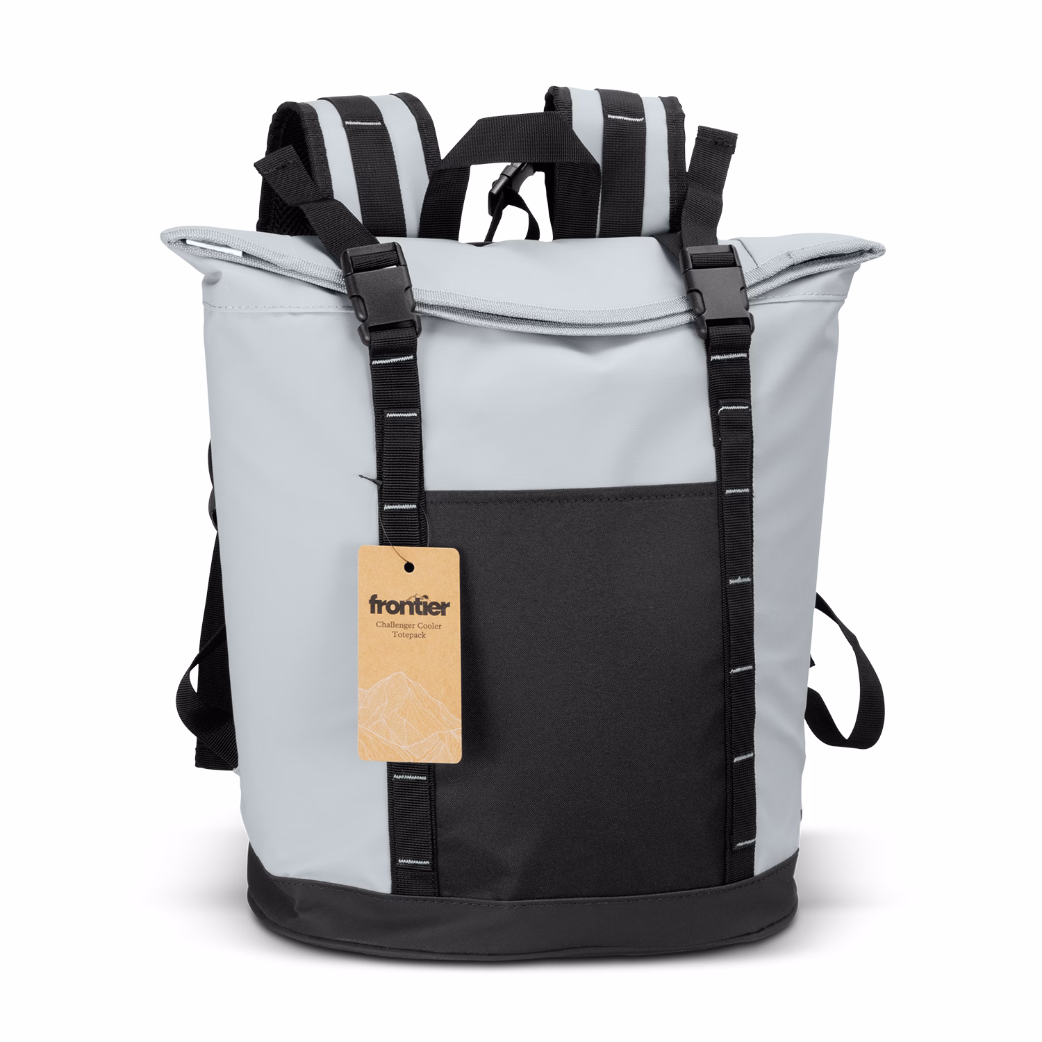 A stylish 15L cooler totepack designed for outdoor adventures. Made from two-tone water-resistant tarpaulin fabric, it keeps contents cool, secure, and protected from the elements. Featuring a flat fold-down top with snap-release buckles, the main compartment is insulated with PE foam encased in a water-resistant PEVA lining. Padded carry straps provide support and hands-free convenience, while the large front pocket offers a high-impact branding area. Presented with a Frontier hangtag.