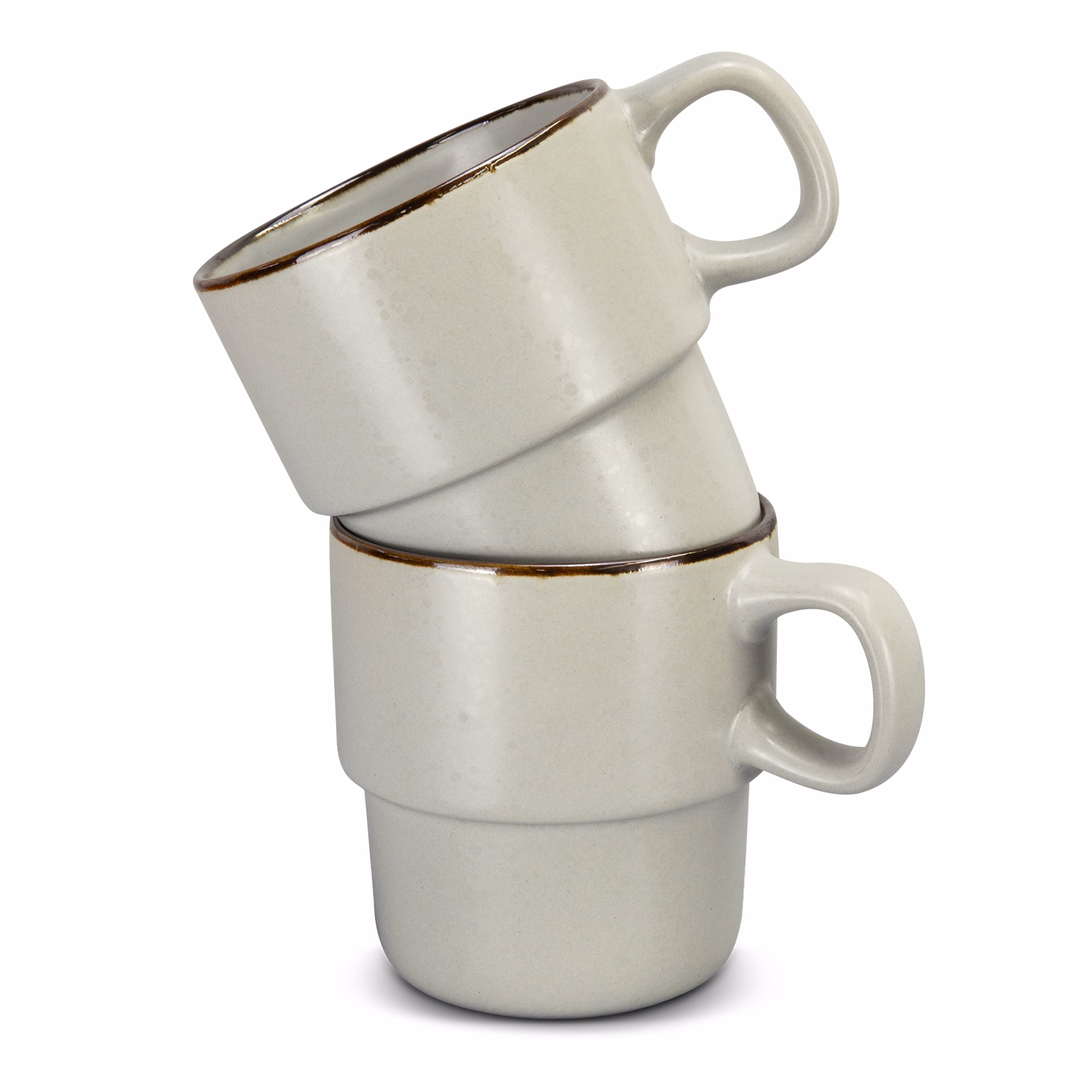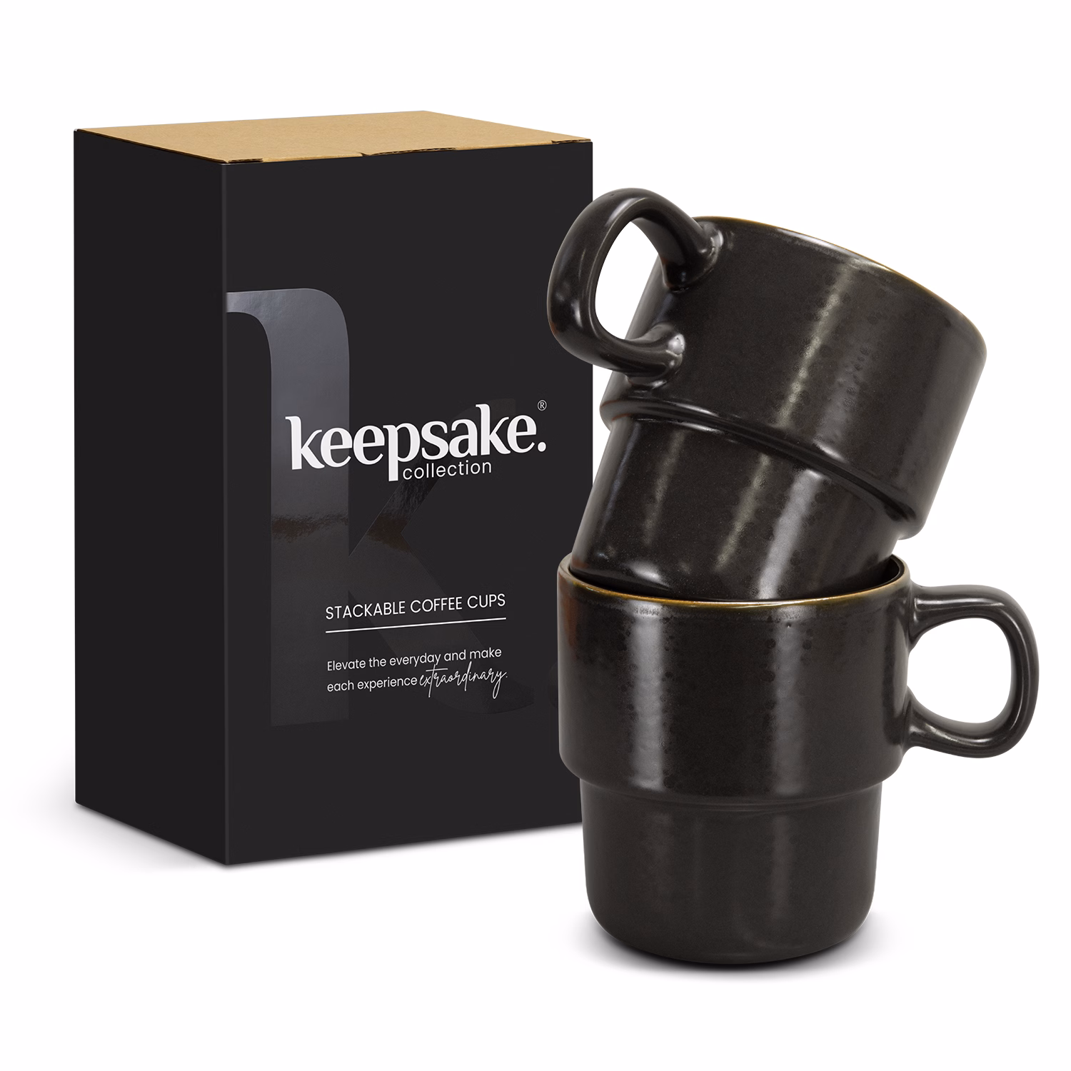 Set of two rustic 350ml stackable ceramic mugs. Featuring a unique mottled glaze and metallic rim detail, the stackable design makes for convenient, easy storage - perfect for any kitchen or office. Beautifully presented in a natural kraft gift box with a Keepsake branded sleeve.