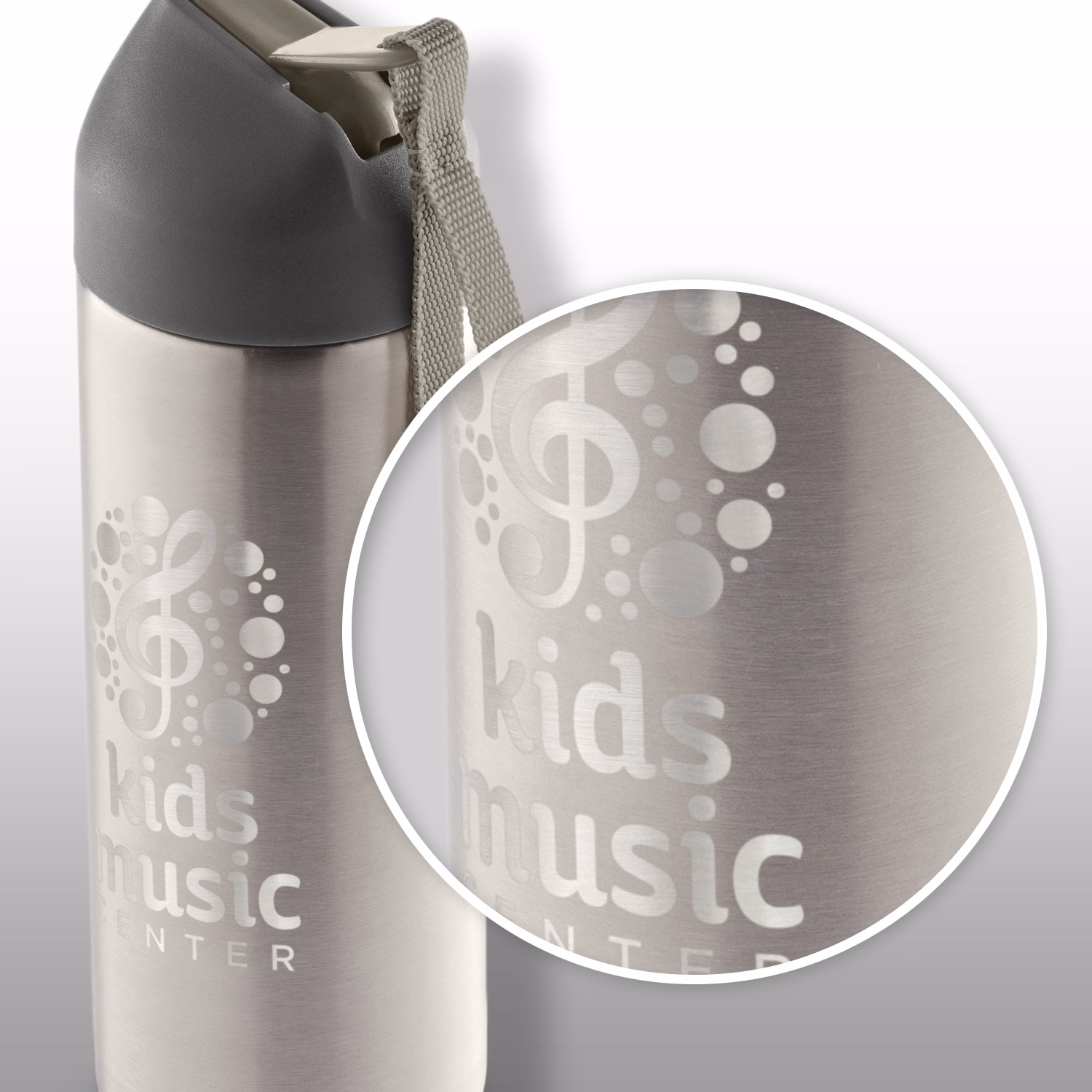 Exceptional 500ml BPA-free stainless steel water bottle from XD which has a secure screw on lid with a woven carry strap that acts as a quick release for the flip out drinking valve. The bottle laser engraves to a natural etch and is nicely presented in an XD gift box. This product is not dishwasher safe and handwashing is recommended.
