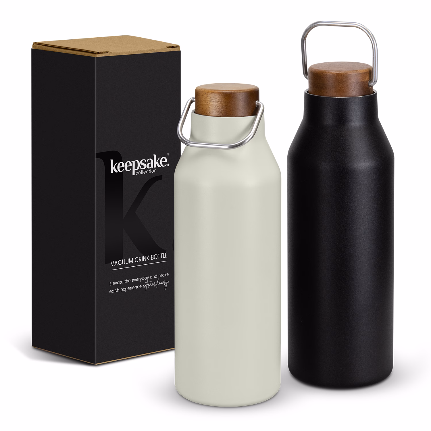 Attention to detail is of the essence with this 580ml recycled stainless steel double wall vacuum bottle. Its unique shape is complemented by a natural acacia lid, which recesses beautifully into the bottleneck, exposing a designer-finished silver edging for an elegant touch. This Keepsake bottle is BPA-free and will keep drinks cold for 24 hours or hot for up to 12 hours. The stainless-steel handle ensures easy carrying, and the bottle comes presented in a Keepsake natural gift box, making it a sophisticated and functional accessory for anyone who appreciates a touch of class.