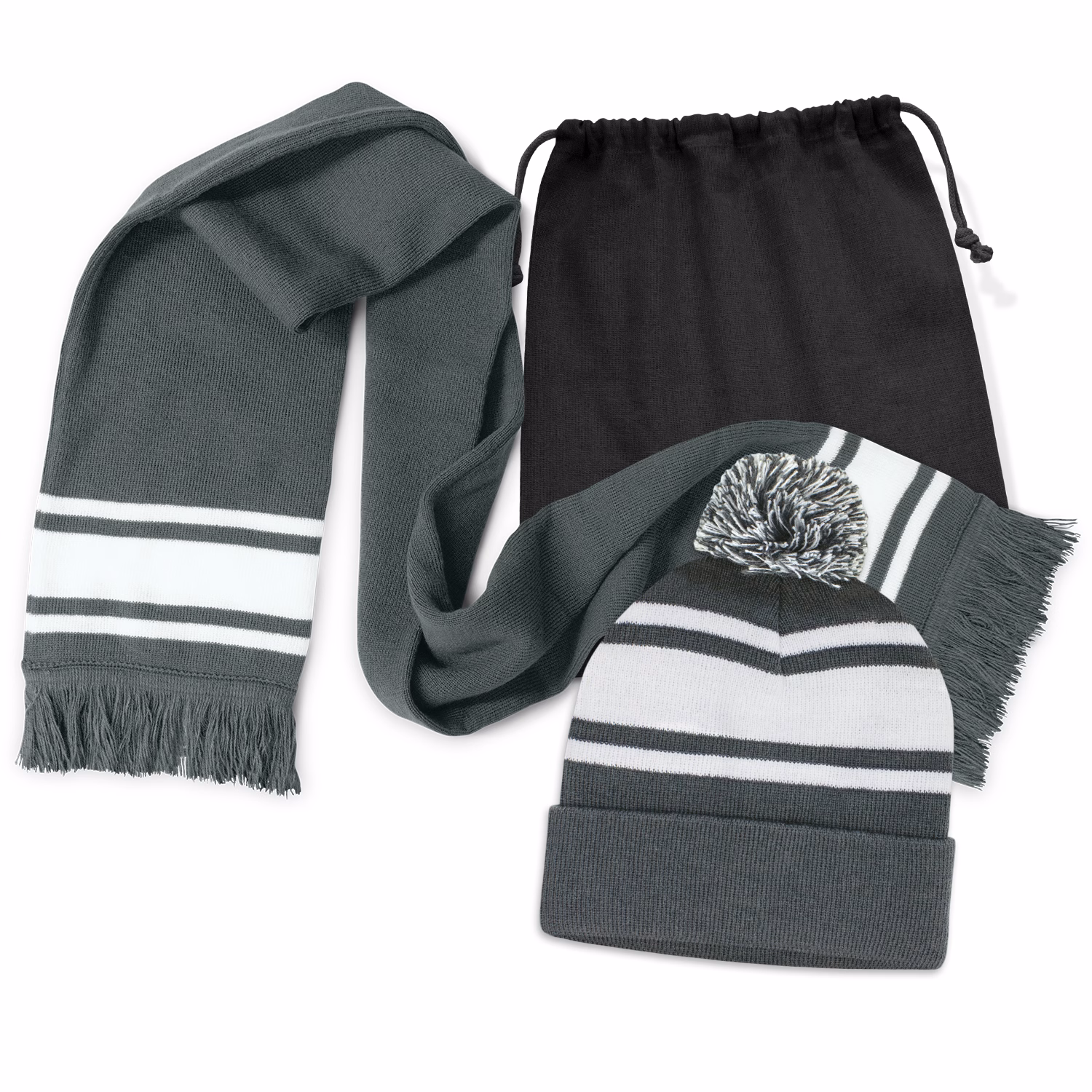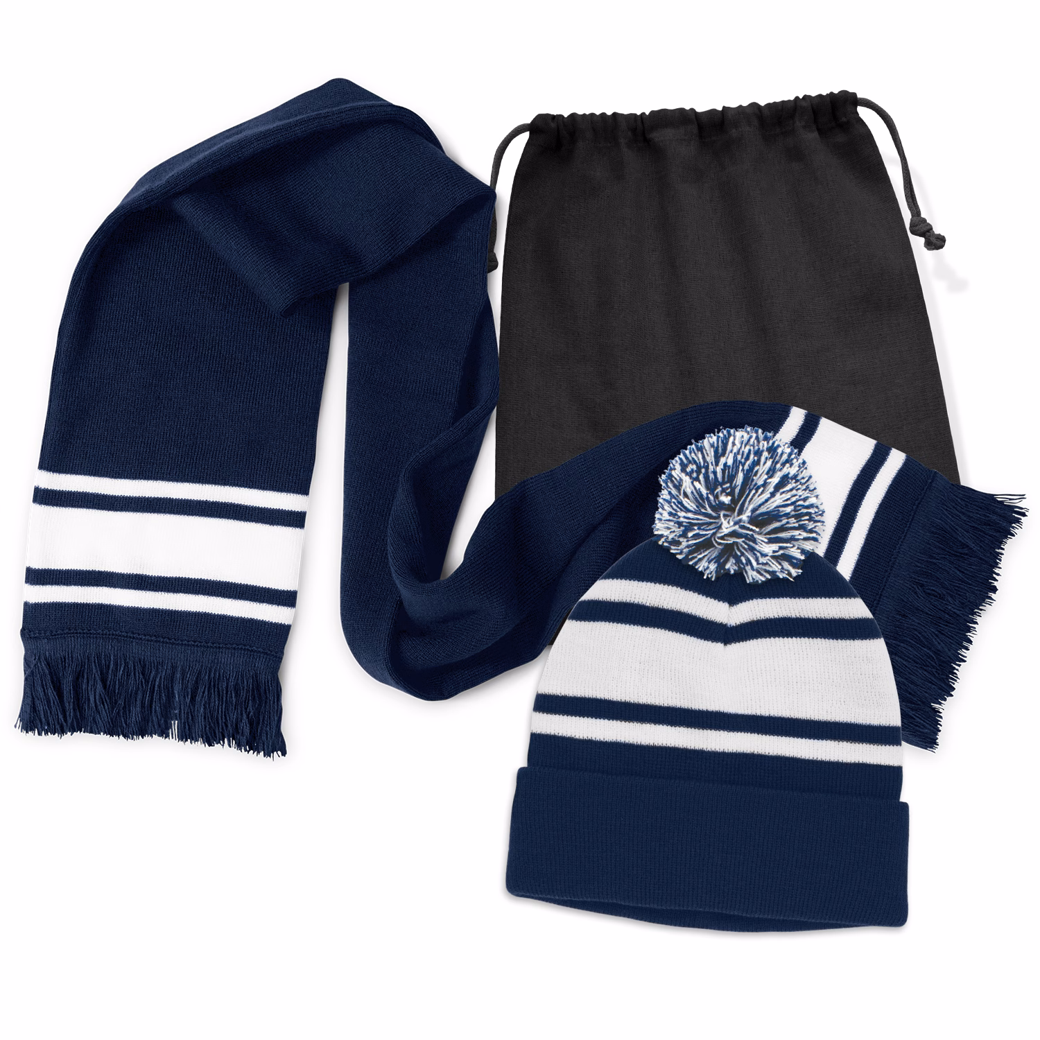 Stay warm in style with this matching striped scarf and beanie set. Knitted from soft, acrylic yarn, the scarf features a classic tassel trim, while the beanie includes a roll-up cuff and a fun pom pom. With coordinated colours and patterns, this set offers a cosy, comfortable look for chilly days.