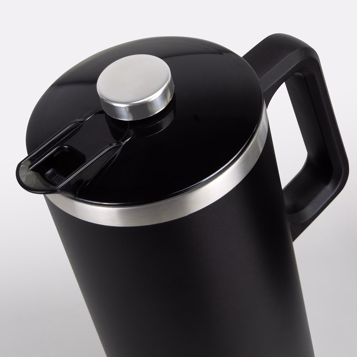 A double wall vacuum insulated coffee press from Frontier that boasts a 1.1L capacity. Designed to keep coffee hot for longer, it is made from durable stainless steel with a black powder coat finish and is ideal for home, office, or outdoor use. The precision filter keeps grounds separate for a smooth brew every time. BPA-free and built to last, it comes presented in a natural gift box with Frontier branding.