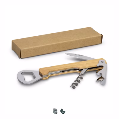 Crafted from stainless steel and beech wood, this wine waiter's knife combines elegance with practicality. Its multi-function design features a built-in bottle opener, corkscrew, and foil cutter, making it an essential tool for wine lovers. Presented in a natural kraft gift box.