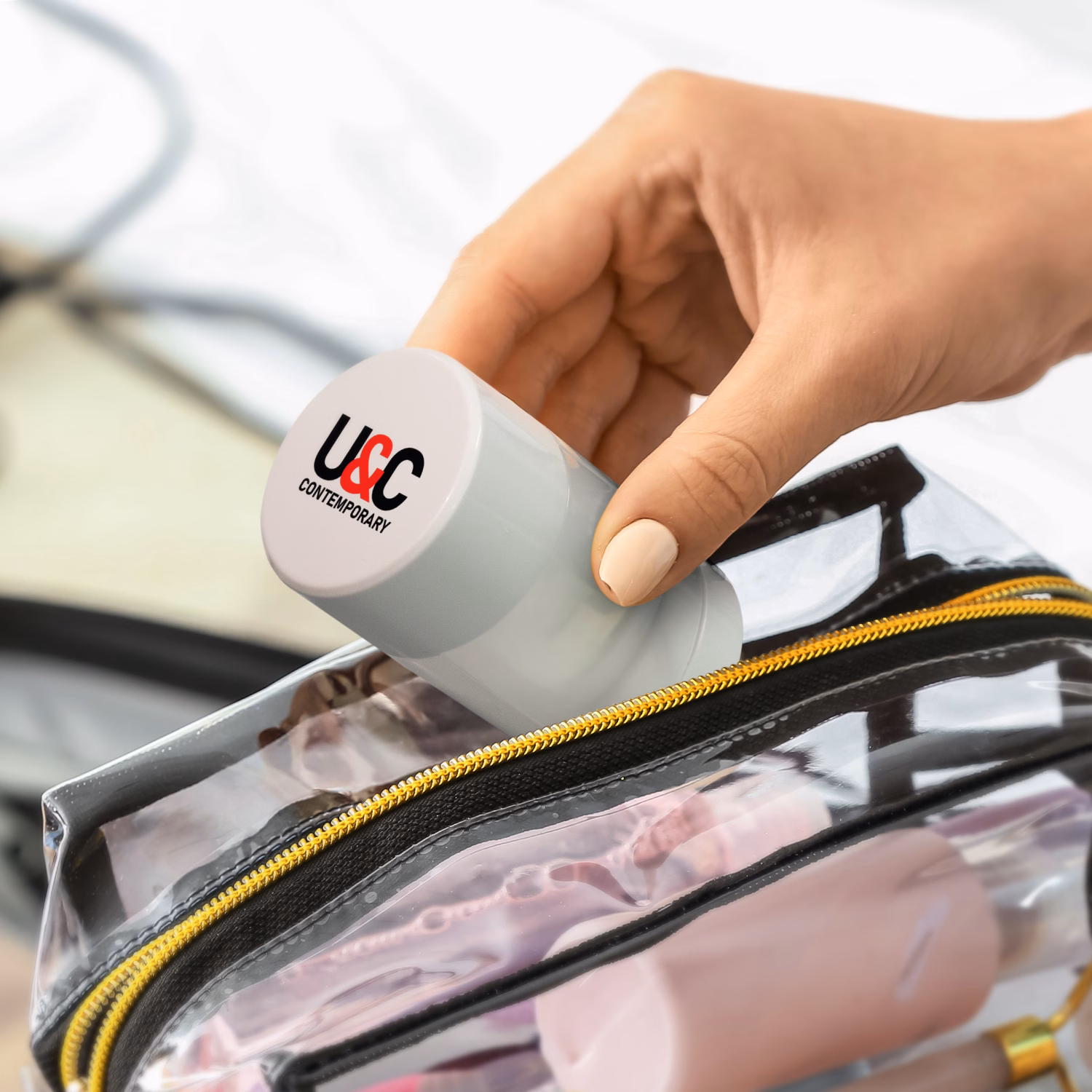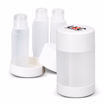 Compact set of three 50ml travel bottles that are designed to fit together into a larger case for tidy storage, which has a large area for prominent branding. Perfect for shampoo, conditioner and body wash, each bottle has a screw on flip cap and can easily be refilled. Their convenient size makes them ideal for meeting international or domestic travel requirements.