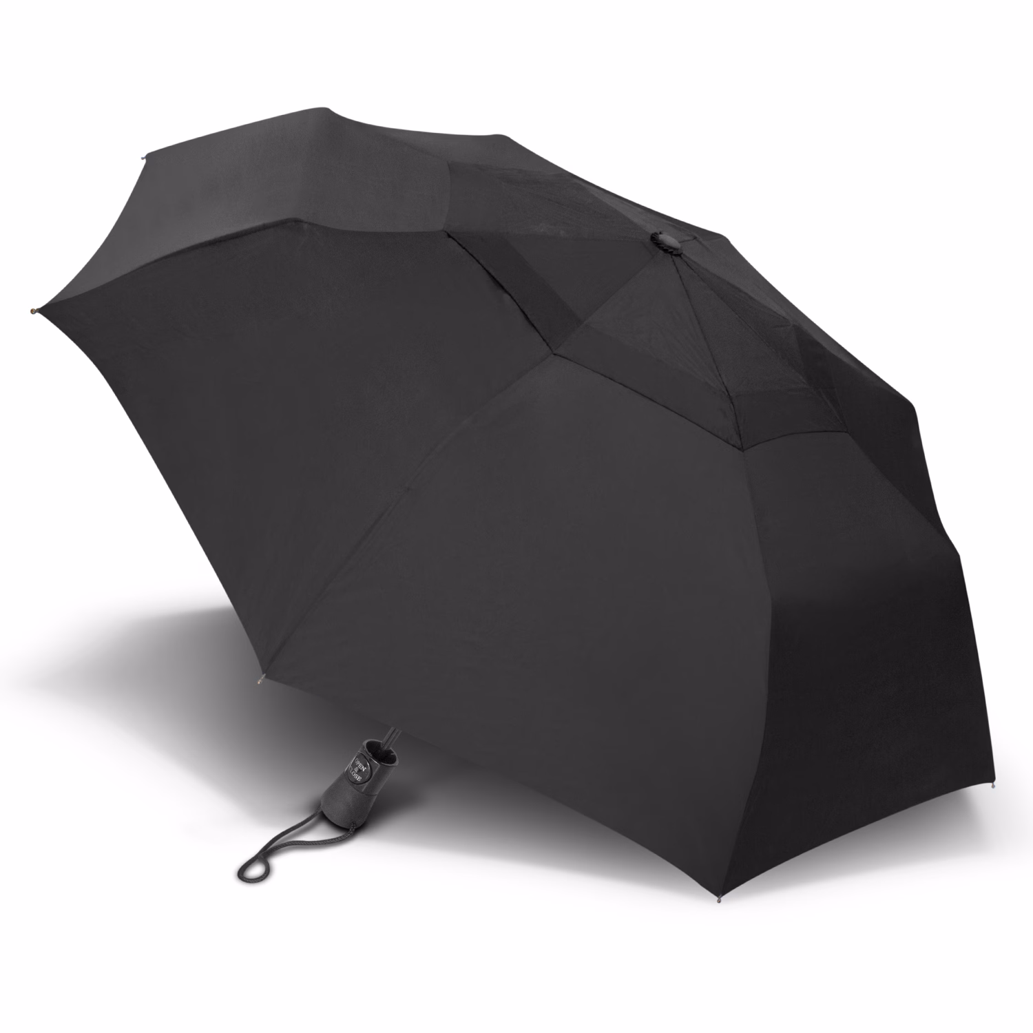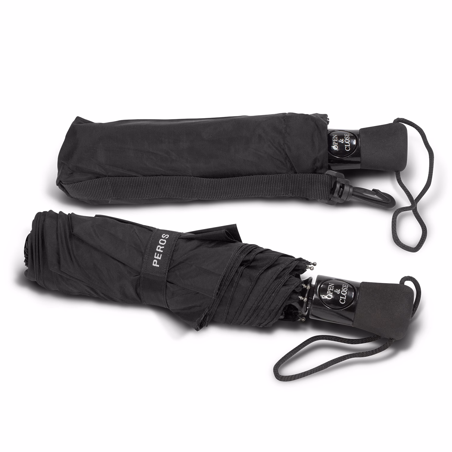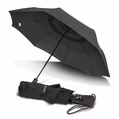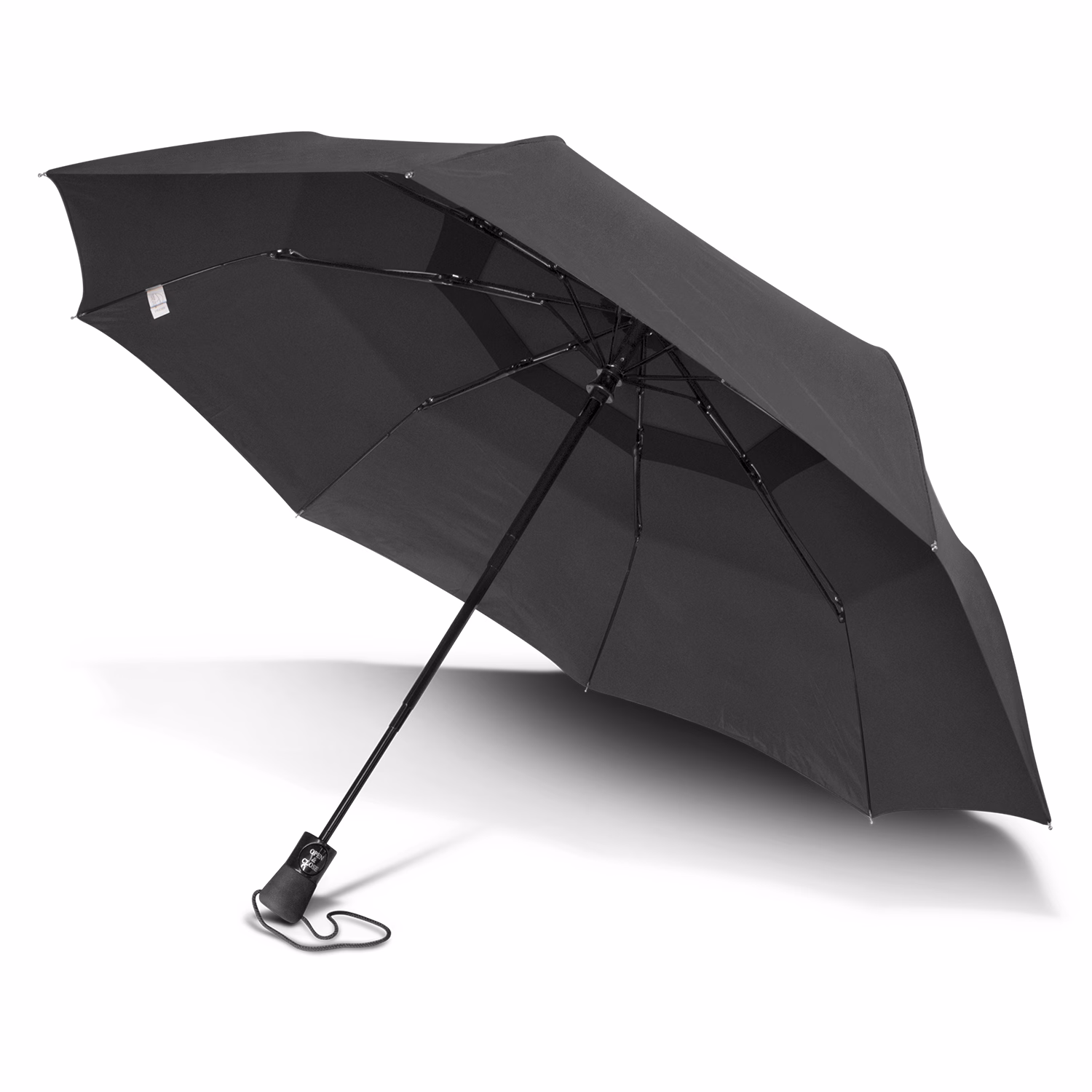 Stay dry in style with the compact, three-stage Metropolitan folding umbrella with automatic opening and closing. It has an eight-panel vented pongee canopy with 54cm fibreglass ribs and an electroplated steel shaft. Metropolitan has an EVA foam handle and a matching pongee sleeve with a dome closure and a clip.