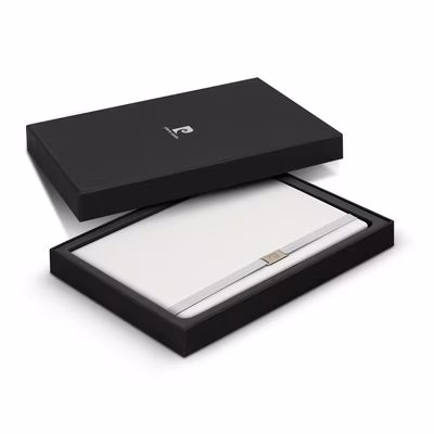 Quality medium-size (approximately A5) notebook presented in a stylish giftbox. The notebook that has 80 leaves of cream lined 80gsm paper, with a thermo PU cover and a branded metal buckle.