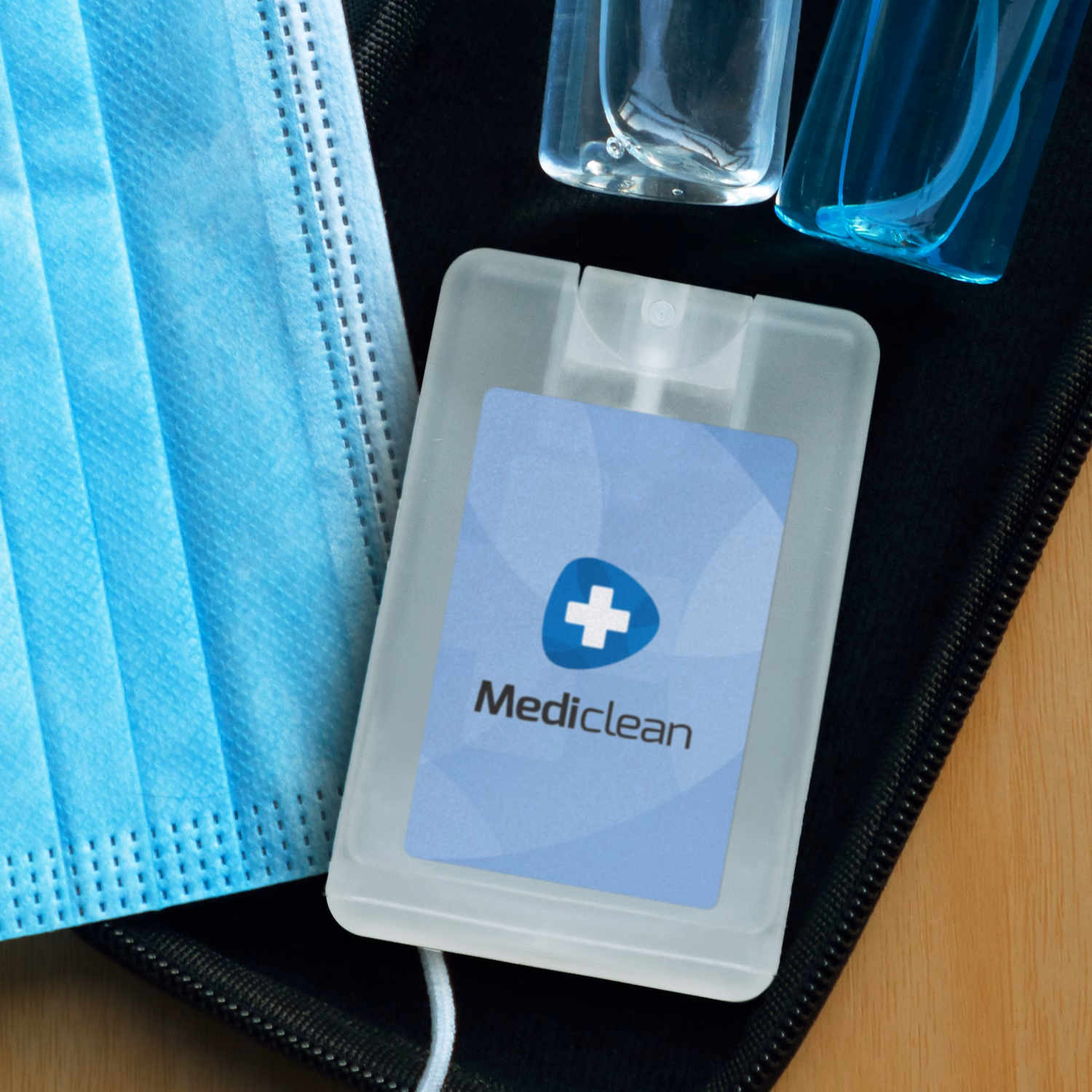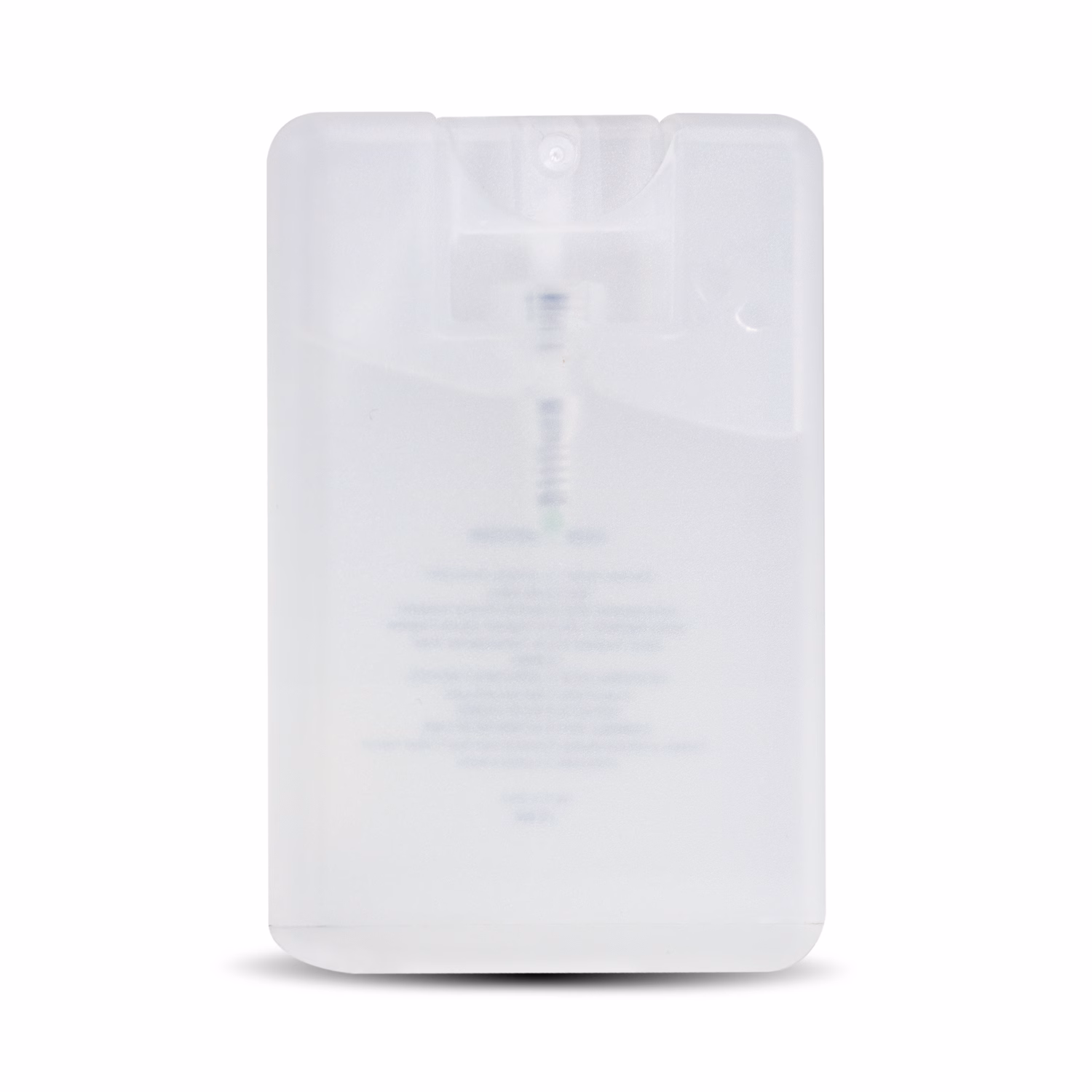 Unique 20ml credit card shaped, pump action hand sanitiser. It has a large branding area on the front with full ingredient information printed on the back.