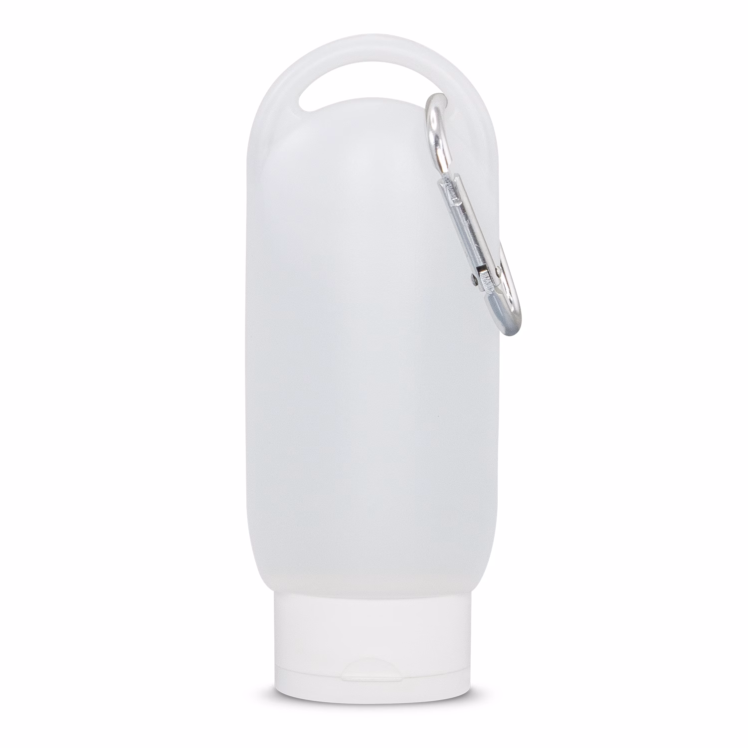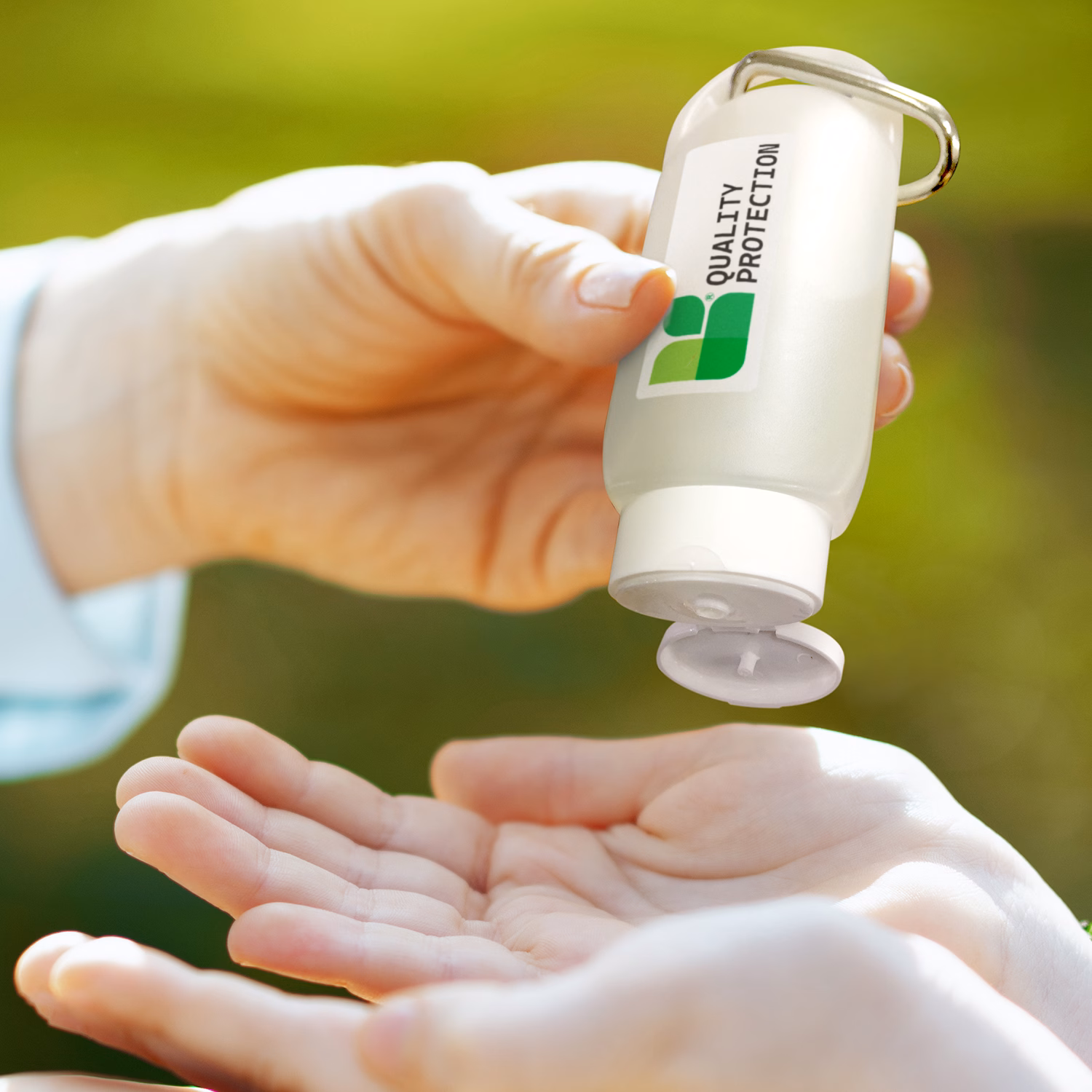 Gel hand sanitiser in a convenient tube with a no-mess flip cap and a carabiner clip. It has ingredients information on the back of the tube.