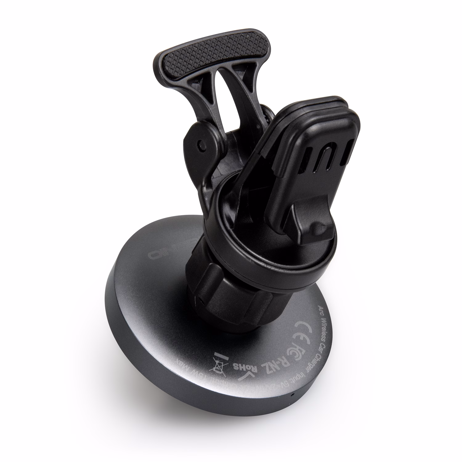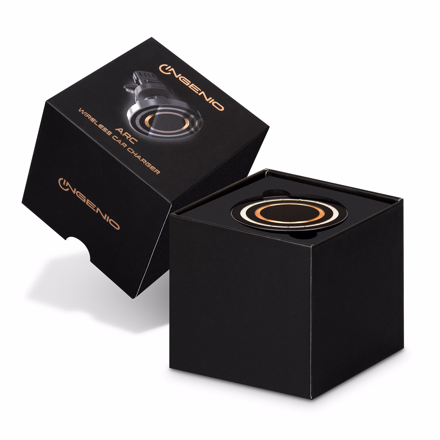 The Arc Wireless Car Charger blends innovation with elegance to deliver quality performance while on the road. Designed to seamlessly integrate into everyday life, this 15W charger clips firmly onto any car vent and features an adjustable brace for additional support. The charger comes with a metal ring for non MagSafe phones, ensuring compatibility with any device. Additional features include LED charging indicator lights, one handed placement, and the ability to use your device in either portrait or landscape positions. The sleek black glass finish, refined copper accents, and quality components make this a standout accessory. Presented in a beautifully crafted INGENIO gift box, it is ideal for corporate gifting, and the ultimate brand statement. INGENIO - Designed to lead, built to last, made to inspire.