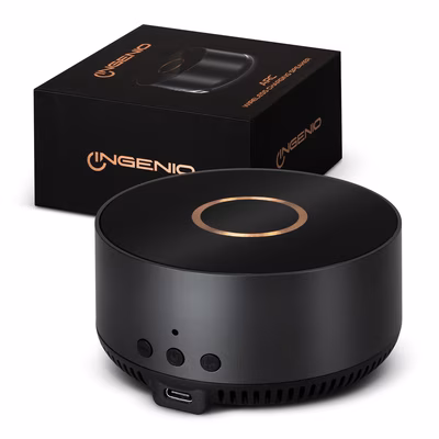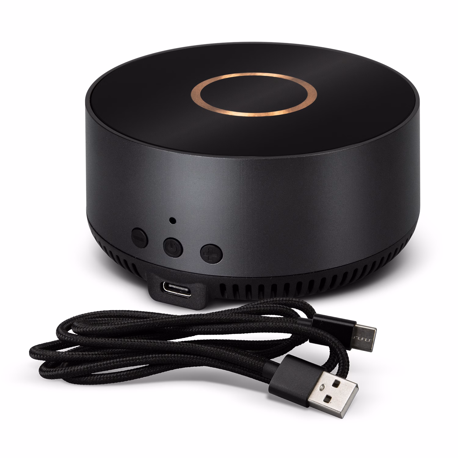 The Arc Wireless Charging Speaker blends innovation with elegance to deliver quality performance. Designed to seamlessly integrate into everyday life the speaker features both Bluetooth connectivity and wireless charging capabilities. Offering high-quality sound alongside intuitive functions, including track navigation, call management, and number recall, the speaker also boasts an LED light ring on the base to indicate charging status. The sleek black glass finish, refined copper accents, and quality components make the Arc Wireless Charging Speaker a standout accessory. Presented in a beautifully crafted INGENIO gift box, it is ideal for corporate gifting, and the ultimate brand statement. INGENIO - Designed to lead, built to last, made to inspire.